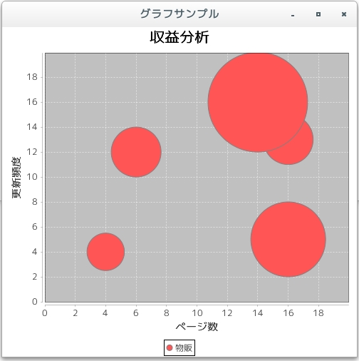 JFreeChart chart = ChartFactory.createBubbleChart("収益分析",