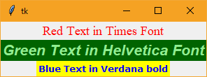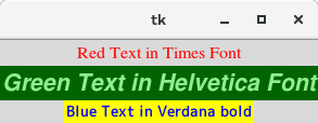 ラベル、テキスト、キャンバスウィジェットのようないくつかの Tk ウィジェットでは、テキストの表示に使用するフォントを指定できます。 これは属性 "font" を設定することで実現できます。 通常は「フォント」設定オプションを使用します。 フォントは、プラットフォームに依存しないいくつかの領域の 1 つであると考える必要があります。 属性 fg を使用してテキストを別の色にすることができ、属性 bg を使用してラベルの背景色を変更することができます。 import tkinter as tk root = tk.Tk() tk.Label(root, text="Red Text in Times Font", fg = "red", font = "Times").pack() tk.Label(root, text="Green Text in Helvetica Font", fg = "light green", bg = "dark green", font = "Helvetica 16 bold italic").pack() tk.Label(root, text="Blue Text in Verdana bold", fg = "blue", bg = "yellow", font = "Verdana 10 bold").pack() root.mainloop()結果は次のようになります。 ![]() |