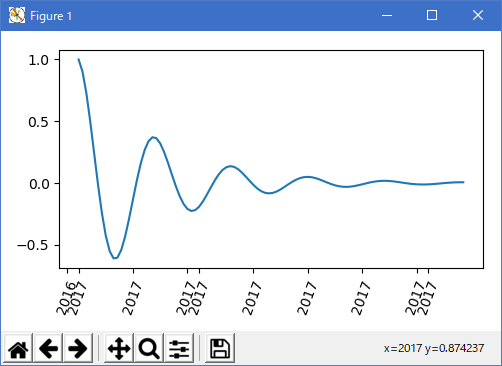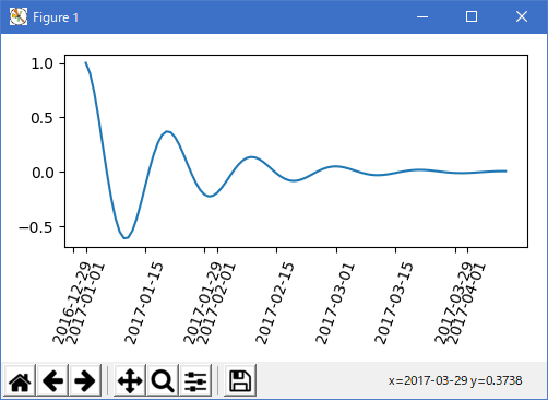 Matplotlib は、プロット引数として datetime.datetime オブジェクトと numpy.datetime64 オブジェクトを受け入れることができます。 日付と時刻には特殊な書式設定が必要です。手動の介入が有効な場合があります。 日付を助けるために、日付には、matplotlib.dates モジュールで定義されているスペクトル Locator と Formatters があります。 簡単な例は次のとおりです。 目盛りのラベルをどのように回転させて、お互いがあふれないようにするか注意してください。 import matplotlib import matplotlib.pyplot as plt import numpy as np from matplotlib.font_manager import FontProperties import datetime x1 = np.linspace(0.0, 5.0, 100) y1 = np.cos(2 * np.pi * x1) * np.exp(-x1) fig, ax = plt.subplots(figsize=(5, 3), tight_layout=True) base = datetime.datetime(2017, 1, 1, 0, 0, 1) time = [base + datetime.timedelta(days=x) for x in range(len(y1))] ax.plot(time, y1) ax.tick_params(axis='x', rotation=70) plt.show() ![]() 上のラベルのフォーマットは受け入れられるかもしれませんが、選択肢はむしろ独特のものです。 matplotlib.dates.AutoDateLocator を変更することで、月の初めにティックを倒すことができます import matplotlib import matplotlib.pyplot as plt import numpy as np from matplotlib.font_manager import FontProperties import datetime import matplotlib.dates as mdates x1 = np.linspace(0.0, 5.0, 100) y1 = np.cos(2 * np.pi * x1) * np.exp(-x1) locator = mdates.AutoDateLocator(interval_multiples=True) base = datetime.datetime(2017, 1, 1, 0, 0, 1) time = [base + datetime.timedelta(days=x) for x in range(len(y1))] fig, ax = plt.subplots(figsize=(5, 3), tight_layout=True) ax.xaxis.set_major_locator(locator) ax.plot(time, y1) ax.tick_params(axis='x', rotation=70) plt.show() ![]() ただし、これにより目盛りのラベルが変更されます。 最も簡単な修正は matplotlib.dates.DateFormatter にフォーマットを渡すことです。 また、29 日と翌月は非常に近いことに注意してください。 これを修正するには、dates.DayLocator クラスを使用します。これにより、使用する月の日のリストを指定できます。 同様のフォーマッタは matplotlib.dates モジュールにリストされています。