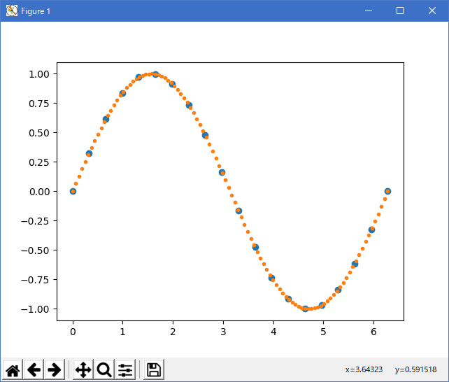 この事例は、Windows10_1909 で Python 3.9.0 環境では、動作しません。( from matplotlib.mlab import stineman_interp が削除されたのか? ) import matplotlib.pyplot as plt from numpy import pi, sin, linspace from matplotlib.mlab import stineman_interp x = linspace(0, 2*pi, 20) y = sin(x) yp = None xi = linspace(x[0], x[-1], 100) yi = stineman_interp(xi, x, y, yp) fig, ax = plt.subplots() ax.plot(x, y, 'o', xi, yi, '.') plt.show() |
