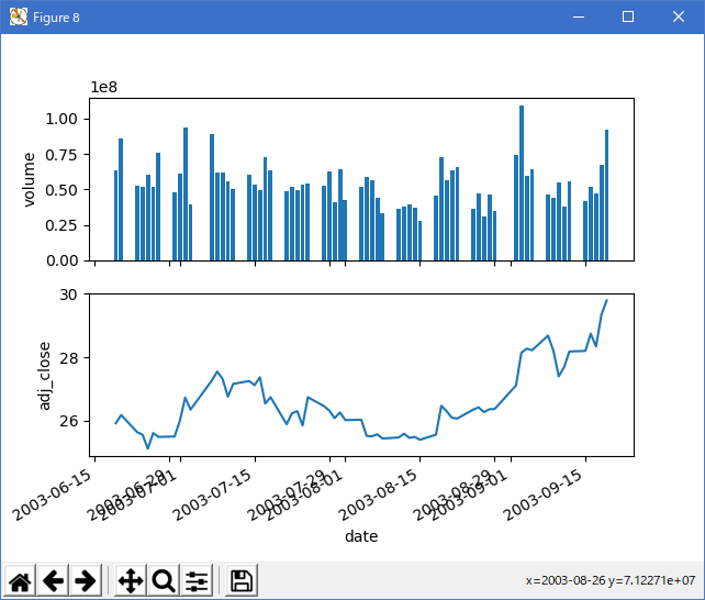 plt.plotfile(fname, ('date', 'volume', 'adj_close'))