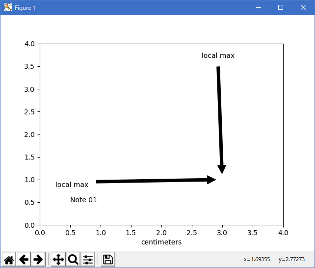 ax.annotate('local max', xy=(3*cm, 1*cm), xycoords='data',