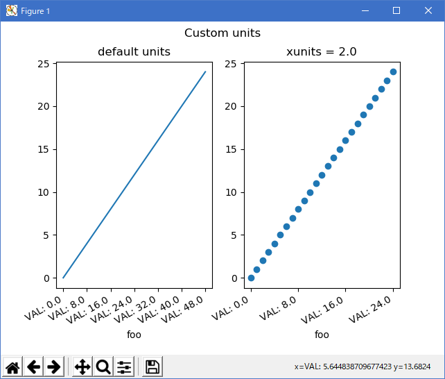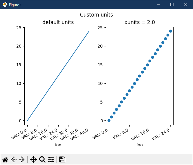 "単位"に応じて変換と異なるティックフォーマットをサポートするモックアップ "Foo" ユニットクラス。 ここでは、 "単位"はスカラ変換係数ですが、この例は、クライアントパッケージがどのような単位のパッケージを使用するかに完全に無関心であることを示しています。